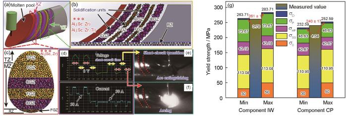 Microstructure evolution mechanisms (a-f) and strengthening mechanism (g) of WAAM Al-Mg-Sc-Zr alloy[13] (FGZ—fine equiaxed grain zone, CGZ—coarse equiaxed grain zone; σ0 is the YS of pure Al (30-50 MPa); σHP, σSS, σP, and σD are the YS induced by grain refinement, solid solution strengthening, precipitation strengthening, and dislocation strengthening, respectively)