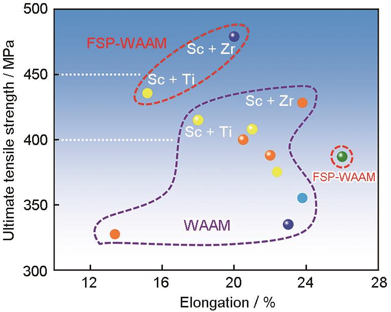 | Fig.13 Relationship between UTS and EL of WAAM Al-Mg-Sc alloys[ |