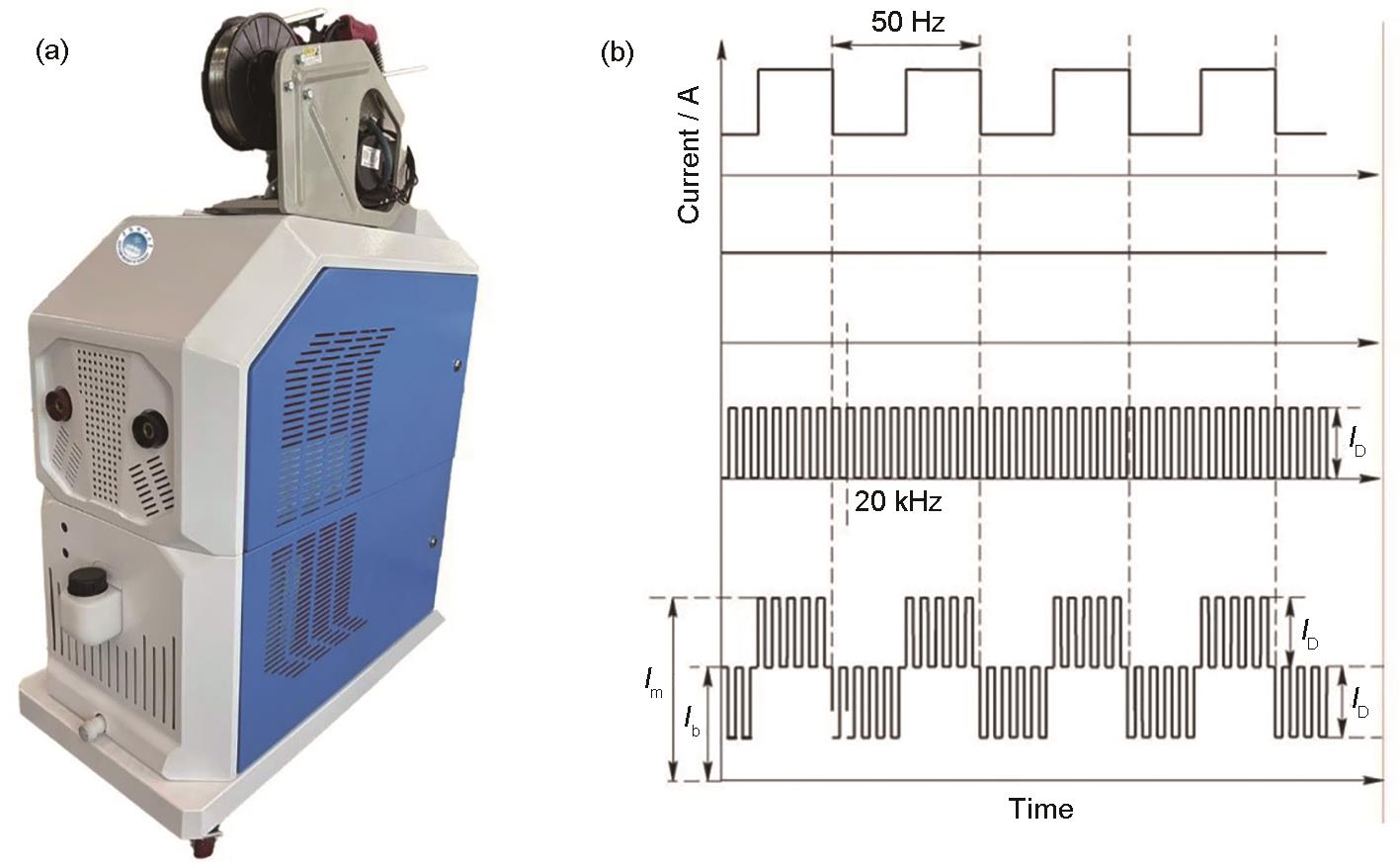 | Fig.4 Underwater high-power fast pulse welding power supply prototype and related waveform diagrams (a) welding power supply prototype (b) fast pulse principle diagram (Ib—secondary current, Im—principal current, ID—basic current) |