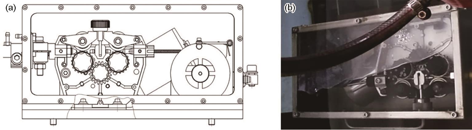 | Fig.6 Schematic (a) and photograph (b) of lightweight fully sealed wire feeding device |