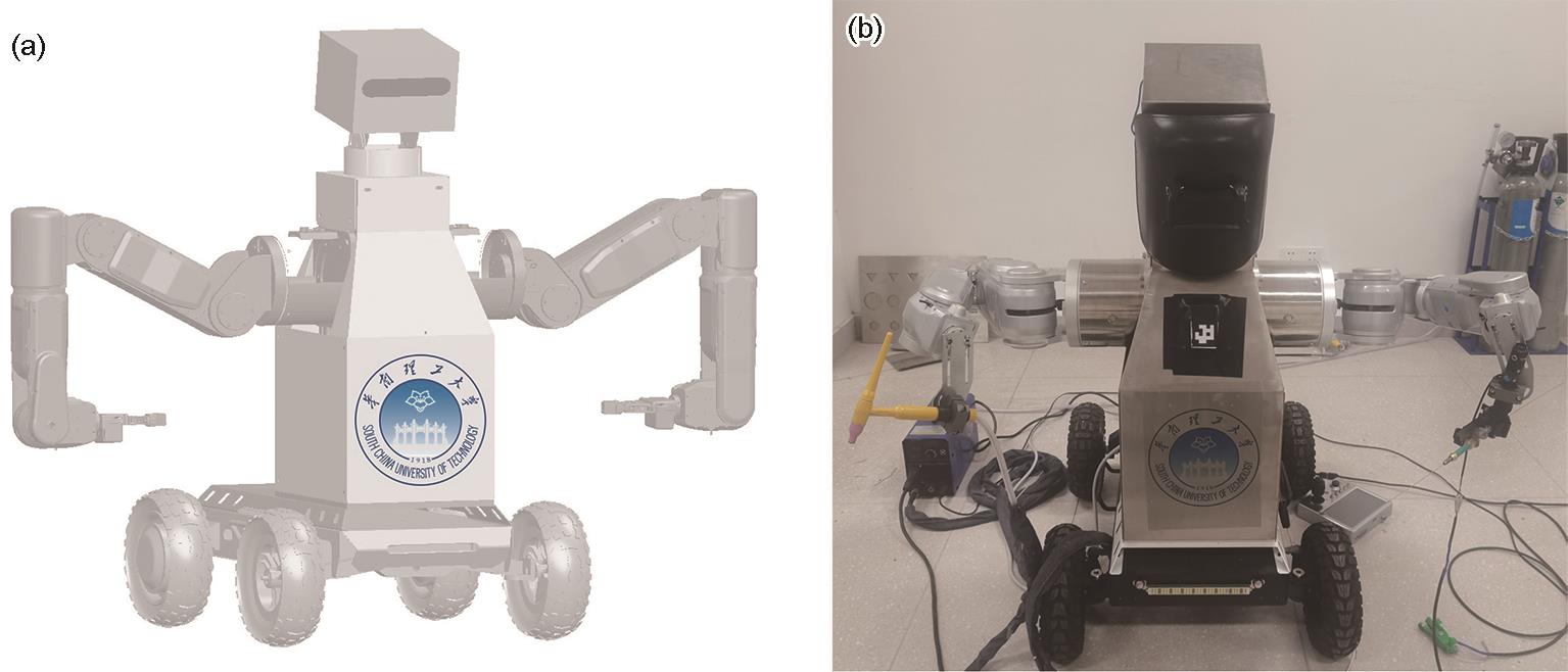 | Fig.9 Wheeled humanoid welding robot prototype (a) robot model diagram (b) robot physical photograph |