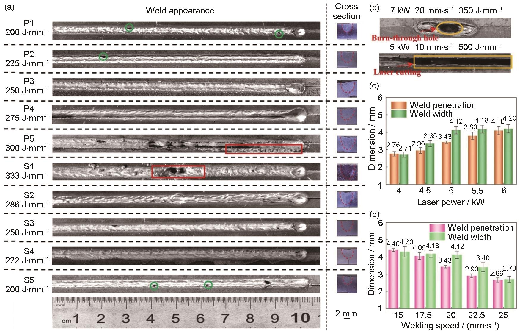 | Fig.16 Local dry underwater laser welded parts under different laser line energies[ (a) morphology (Green cycles show the slight incomplete fusion at the edge of WM; red rectangles show the spatters and burn-through holes likely emerged) (b) defects (c, d) effect of power (c) and speed (d) on dimensions |