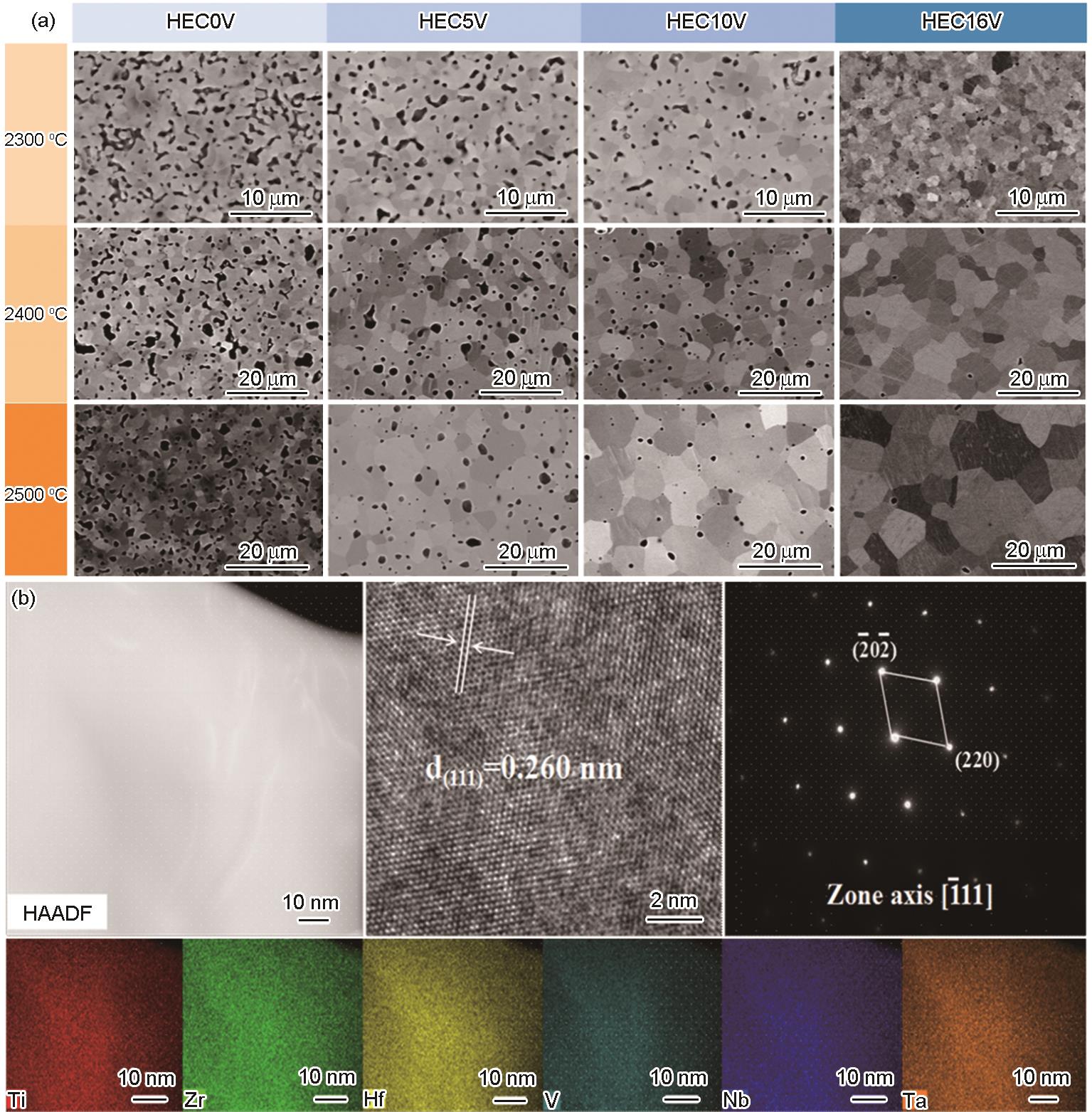 | Fig.2 Microscopic morphology characterizations of (TiZrHfVNbTa)C high-entropy carbides (HECs)[ (a) SEM images of (TiZrHfVNbTa)C HECs with different V additions and sintering temperatures (Samples HEC0V, HEC5V, HEC10V, and HEC16V correspond to molar fractions of V in the HECs of 0%, 5%, 10%, and 16.67%, respectively) (b) TEM characterizations of sample HEC16V at 2300 oC |