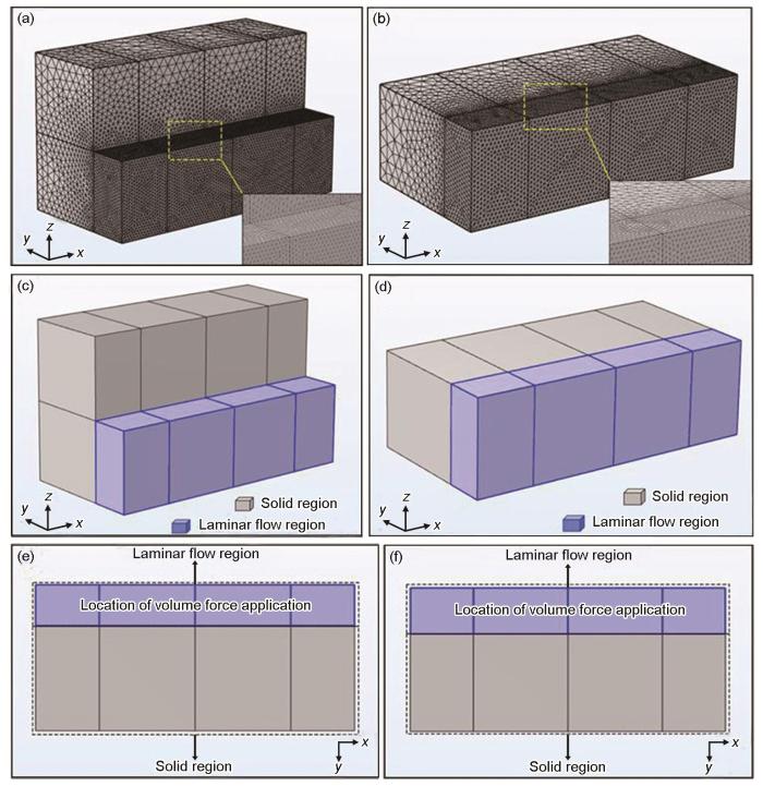 Schematics of grid division (a, b), domain division (c, d), and volume force application location (e, f) in root layer and filling layer (a, c, e) and top layer (b, d, f) of welded joint (Insets in Figs.2a and b show the locally enlarged grids, Figs.2e and f are top views of Figs.2c and d, respectively)