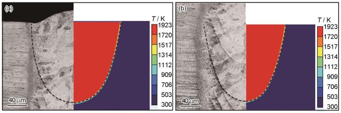 对超声辅助窄间隙激光焊接接头盖面层及中间填充层的温度场仿真结果进行热源校核,结果如图3所示。可见,熔池形貌的仿真结果与实验结果吻合良好。因此,本工作建立的模型可用于有/无超声作用窄间隙激光焊接过程的仿真模拟。