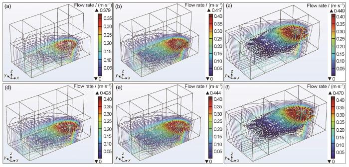 Flow fields of each filling layer in TC4 titanium alloy for narrow gap laser welding without ultrasound at layers 1-1 (a), 1-6 (b), and 1-11 (c); with ultrasound at layers 2-1 (d), 2-6 (e), and 2-11 (f)