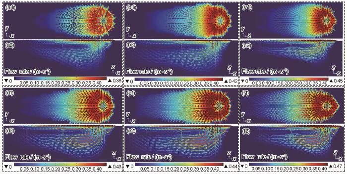 Cross-sectional (a1-f1) and longitudinal sectional (a2-f2) flow fields of each filling layer in TC4 titanium alloy for narrow gap laser welding without ultrasound at layers 1-1 (a1, a2), 1-6 (b1, b2), and 1-11 (c1, c2); with ultrasound at layers 2-1 (d1, d2), 2-6 (e1, e2), and 2-11 (f1, f2)