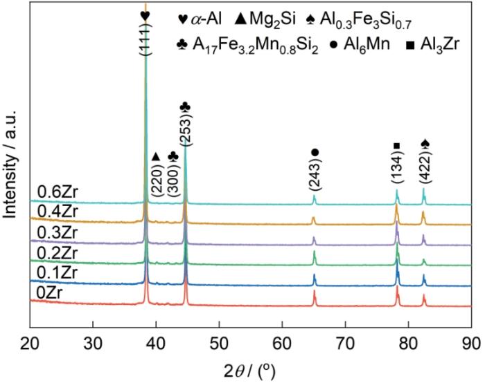 图2为不同Zr含量Al-Mg-Si铸轧板的XRD谱。可以看出,各试样中的Fe均会与Al、Si、Mn等元素结合形成Al0.3Fe3Si0.7和Al17Fe3.2Mn0.8Si2相。而Mn与Al结合形成Al6Mn相。同时,各铸轧板中均形成了Mg2Si强化相。添加Zr后,含Zr铸轧板中开始出现Al3Zr相。