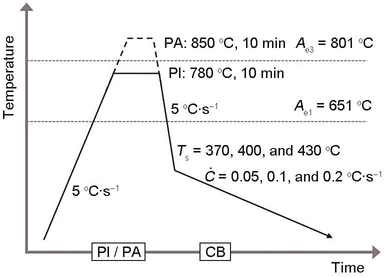 | Fig.1 Schematic of the continuous cooling process from medium temperature in medium Mn steel (Ae3—the highest temperature at which ferrite and austenite phases can coexist in equilibrium, Ae1—the lowest temperature at which ferrite, cementite, and austenite phases can coexist in equilibrium, |