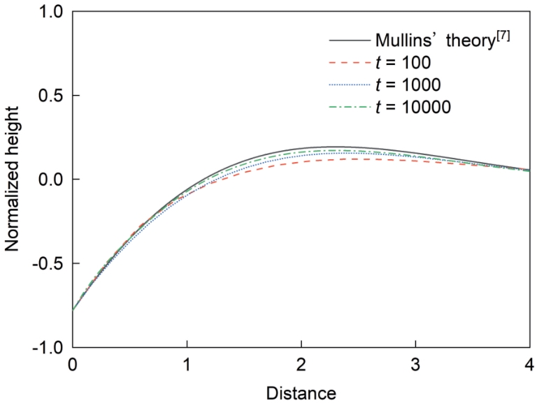 | 图4 相场模拟中不同时刻的沟槽轮廓与Mullins理论预测[ |